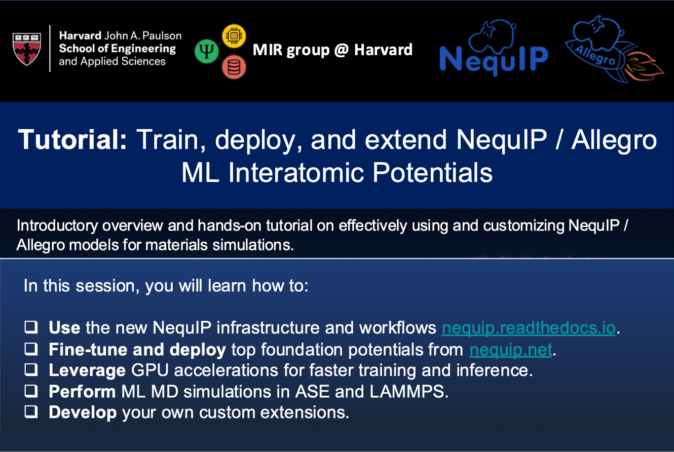 The Kozinsky group is hosting a NequIP Tutorial on Friday, December 5, 2025, to showcase its new infrastructure and features. The event will take place at Harvard, scheduled right after the MRS Fall Meeting. RSVP here.